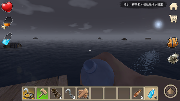 1、开局时用钩子收集资源,注意不要漏木桶,勾不到就下水捞,先造杯子和煮水器,然后造炉子和鱼竿。
