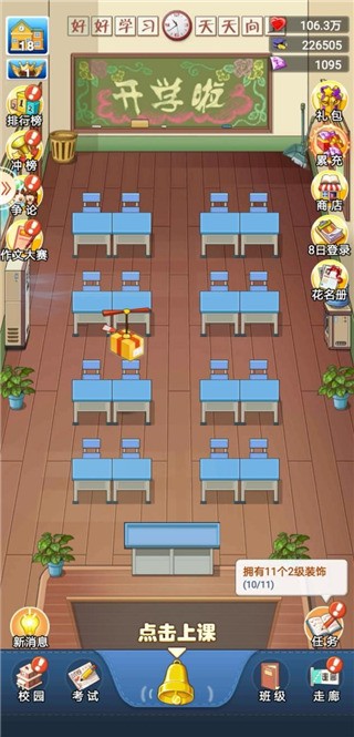 3、升级条件:想要提升校园等级必须满足两个前置条件:首先是学生要通关相应的考试,其次是要升级校园里的相应装饰,满足条件后再消耗一定量的学费,即可完成升级。