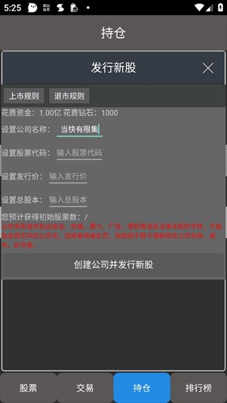 -修改:上市与退市规则修改,增加了创始人的初始持股比例到10%,减少了退市补偿,详见游戏内说明。