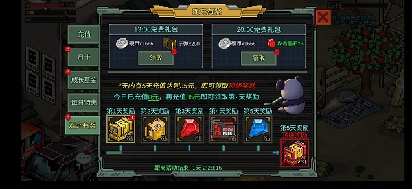 同样无需充值,每天可以领两次奖励,13:00上去能领1666银币,200子弹,20:00上去能领1666硬币,攻击晶石×5!