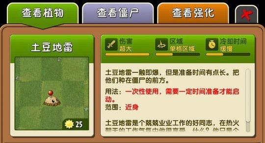 6、重要的一点:土豆雷和巴豆都不能秒杀带棺材的法老僵尸。两种植物的爆发都比较鸡肋,土豆雷瞬间钻出还算不错,可以应急也可以用来炸雪人(雪人走到第一格立刻放下,然后马上喂能量豆),但是它们的分裂能力太坑爹了,比较考验RP。
