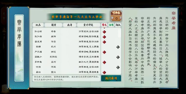 提拔人才和察举孝廉壹·提拔人才是完整继承了华夏1,所以选拔就完了。不过这里涉及的技能,会有等级,等级1为原来基础效果,等级最高6级,约为两倍效果。贰·察举孝廉是新功能,根据汉察举制,每个郡保底有一个推荐,如果一个郡人口超过100万,每多50万再推荐一个。