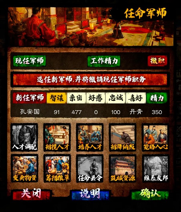 任命军师:用于处理杂务和建言军师是一个最重要的辅助角色,对内政的方方面面都有加成效果。军师人选第一看智谋,第二看亲密度。这两个决定了军师的精力值,精力越高,处理的事情就会越多。
