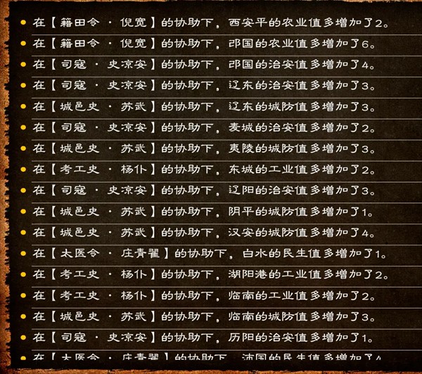 刷满本地的内政值因为即将要把人物外派出去,当城镇、村落、港口的县令,所在派出去之前,将本地的内政刷一波。内政彩蛋如下:提高本地的工业值,本地的仓库存货也会增加;当城市在暴动,手动巡查治安,可以抓壮丁,增加城市兵役;当城市在开仓,手动操作义诊,可以增加人口;当城市发洪水,手动兴修水利,可以增加耕地;当城市处于丰收,可以半价买入平时两倍的军粮;当城市处于瘟疫,手动义诊可以提高城市医学文明;⑥