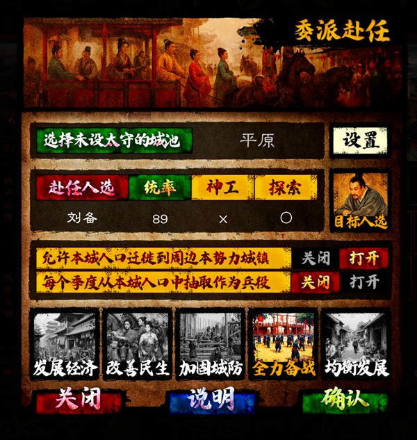 委派各地太守、知县、村长等等用委派功能,将官员派到外地当“一把手”。被委派人到达目的地后,就会自动上任,并根据您预设的方针执政。一个地方一旦有了长官,就会慢慢发展起来,起码不会日渐凋敝,毕竟不是每个城镇村都要重点发展。在君主所在的都城,留十多名智谋和学识高的官员,用于后续开发和录用。
