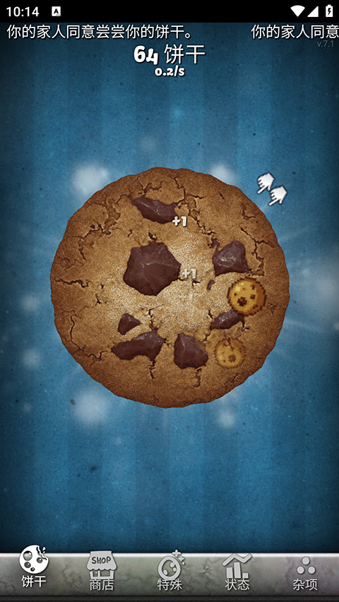 1,进入游戏后,玩家通过疯狂点击屏幕中的大饼干来获取曲奇小饼干
