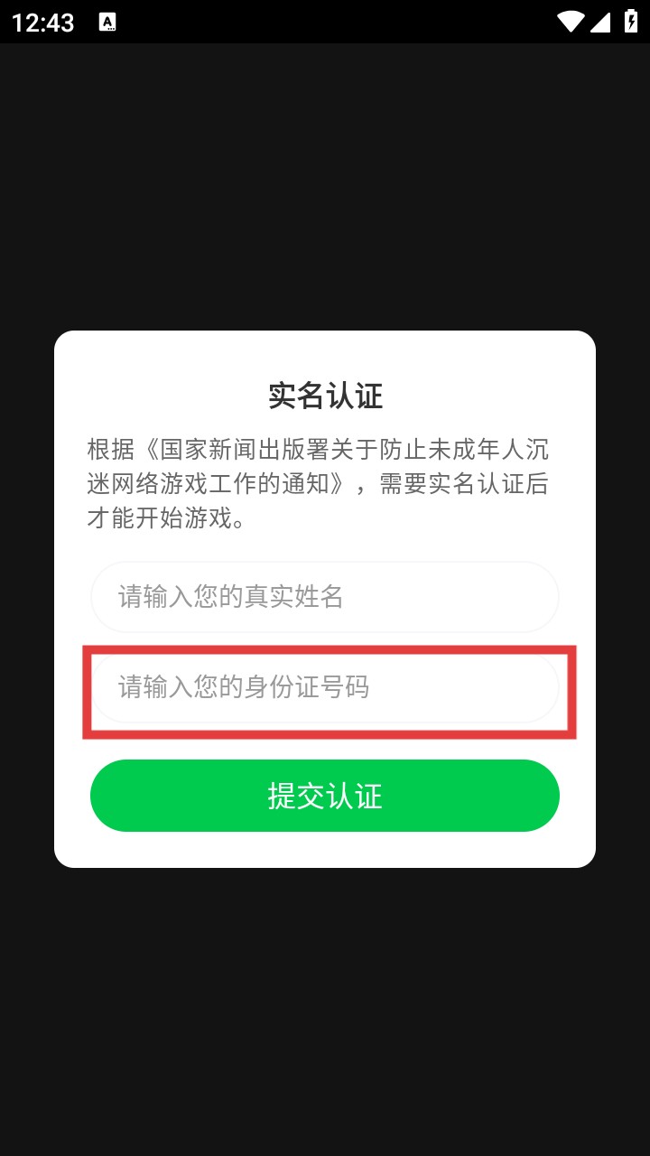 2、第二步,玩家在方框内输入身份证号码进行下一步。