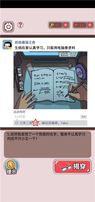 第五关:点击品游网吧,点击电脑上的会员时间,点击桌子上的眼镜镜面,点击男孩手上的笔头,点击三年级二班小李点的赞。