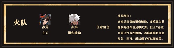 赤痕是高贵的增伤辅助,赤痕做为其他队的挂件也足够优秀,但主C赤荒目前还没有连携拐,赤痕连携是任意角色,即可,所以剩下可以随意带。
