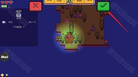 6、当石头都收集完成的时候,就可以建造熔炉,点击右上角的菜单,然后点击建筑,选择好熔炉需要放置的位置,点击【√】即可;