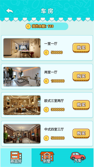 6、点击房车可以购买汽车和房子,当然这些是需要花费大额金币的。