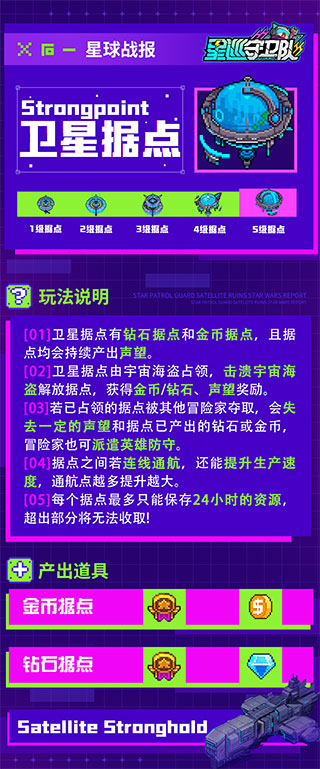 据点类型:卫星据点有【钻石据点】和【金币据点】,且据点均会持续产出【声望】