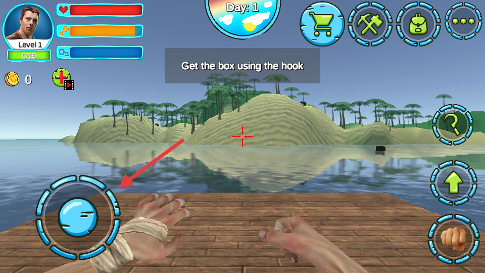 1、利用初始斧头打捞物资扩建木筏并抵御鲨鱼袭击。