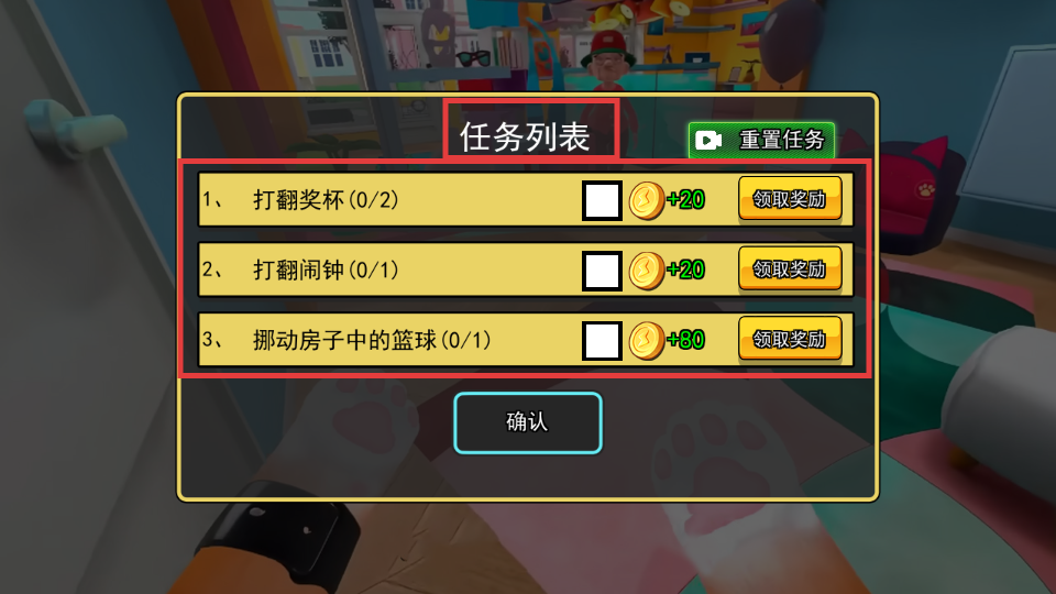 3、查看【任务列表】,按要求完成【打翻奖杯】【打翻闹钟】等任务,领取对应金币奖励。