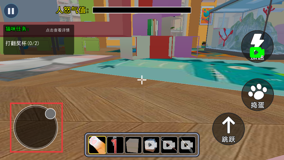 2、通过左下角【移动摇杆】操控小猫移动,结合右侧【加速】【捣蛋】等按钮推进任务。