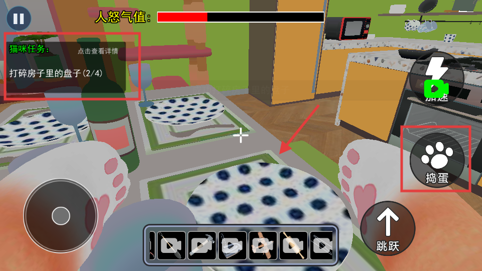4、在厨房场景,根据【猫咪任务】打碎盘子,点击右侧【捣蛋】按钮互动完成任务。