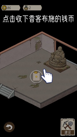 4、回到天王殿内部,此刻将会有香客前来拜佛,在香客离开后点击收下香客布施的钱币即可为寺庙增添香火钱,这些对于寺庙的重修有着至关重要的作用