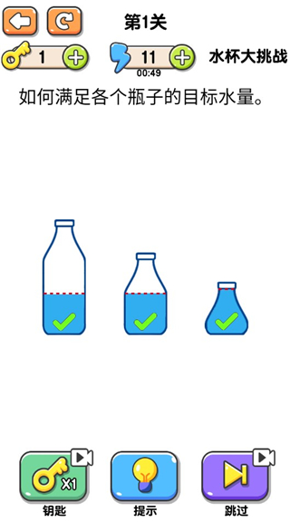 8、水杯大挑战就非常的简单了,万爱只需要将水倒到其他瓶子里就可以了。