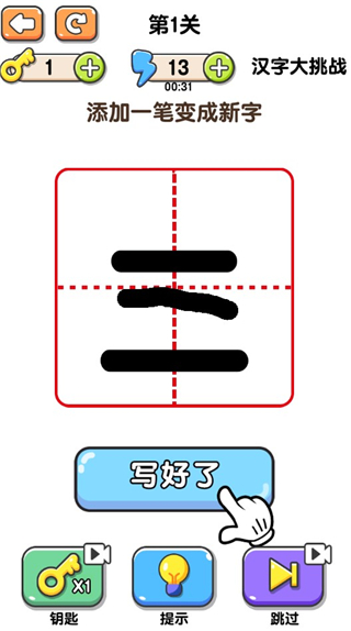 11、汉字大挑战模式需要玩家只能增加一笔完成一个新的汉子。