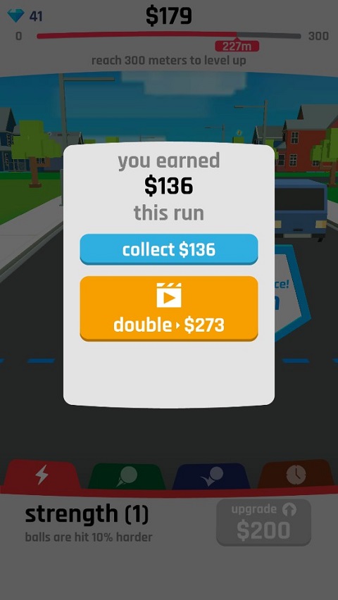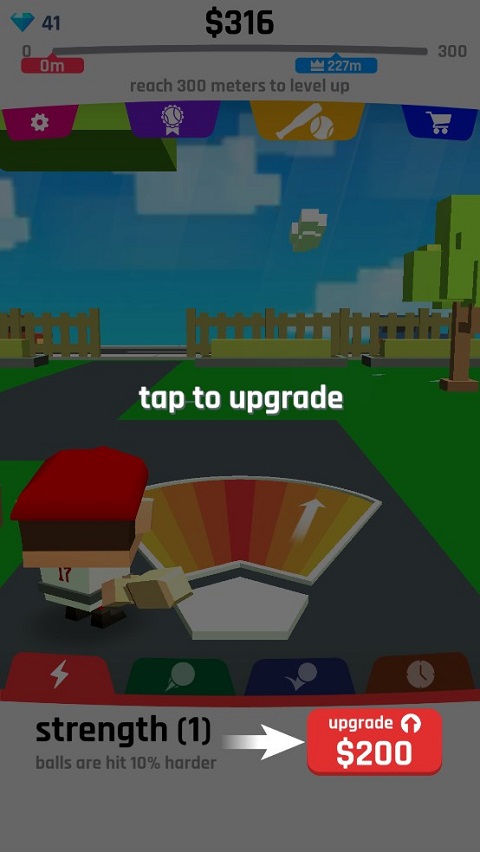 3、期间你可以升级力量,提升技巧来获得更远的击球距离,在人物的底部有红、绿、蓝和橙色的不同升级方式。