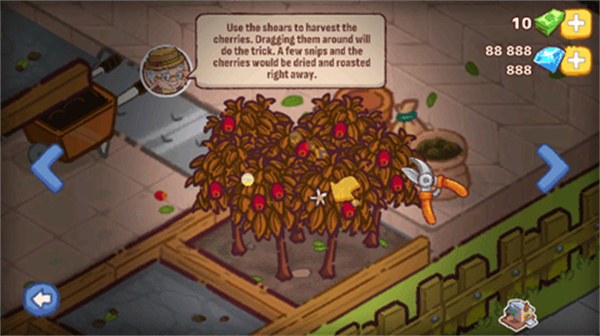 1、首先,跟着游戏的指引去收获成熟的咖啡豆,准备好制作美味的咖啡。