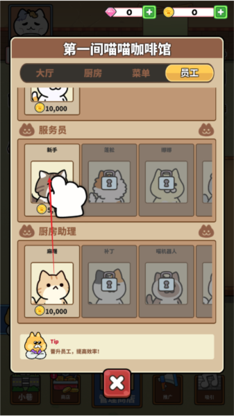 萌系猫咪养成体系:招募能力各异的猫咪员工,每只均有专属技能与性格,搭配时尚制服可提升生产力,合理分配岗位打造高效经营团队,满足收集与养成双重需求。