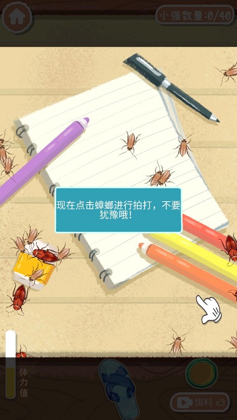 小强跑得快,壳还硬,还会装死还会飞!天哪,赶紧把打小强的体力、速度、力度加满,再换个大点的尺寸,一次拍俩,一巴掌送小强上西天!