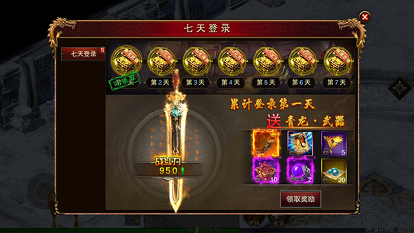 2、七日登录:连续七天,每天登录就送大量豪礼,第一天就送橙色武器青龙。