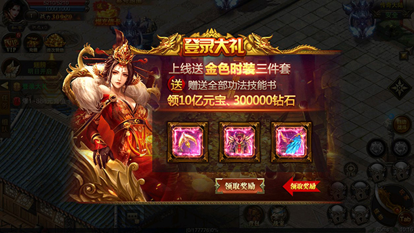 1、开局福利:玩家创建角色后即可领取开局福利,赠送金色时装三件套、十亿元宝、30万钻石以及全功法技能书。