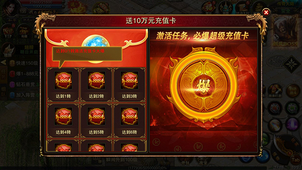 4、十万充值卡:玩家通过提升主角转生阶级即可激活任务,在1到888之间随机爆出充值卡。