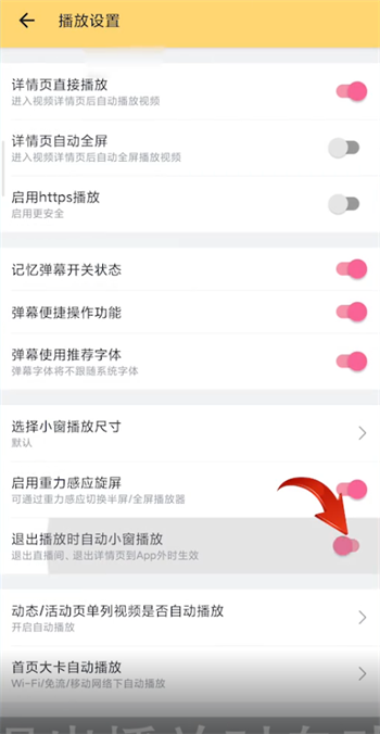 3.在设置页面中点击播放设置,最后再勾选【退出播放时自动小窗口播放】即可开启手机中的小窗口功能。