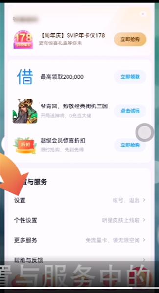 2.向上滑动我的界面至底端,点击设置与服务中的【设置】。