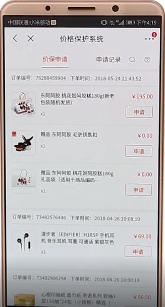 最后点击所购买的商品后面的【申请】即可,60 秒内就可以查看是否在价格保护规则范围之内
