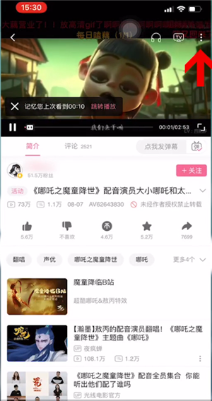 首先打开哔哩哔哩APP,点击想要保存的视频,点击视频右上角三个点标志,