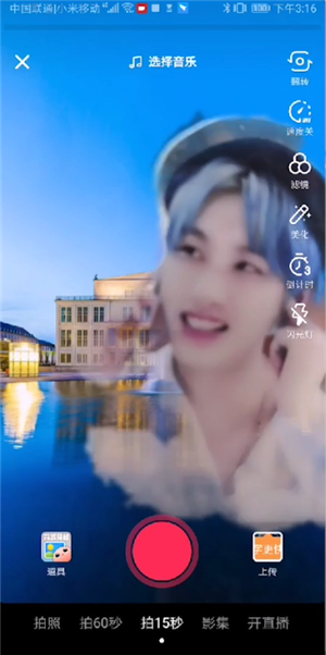 这时在热门分类下即可看到背景穿越特效,也可以点击左下角加号按钮上传图片来更换背景,选择好后点击底部按钮之后就可以进行拍摄了。