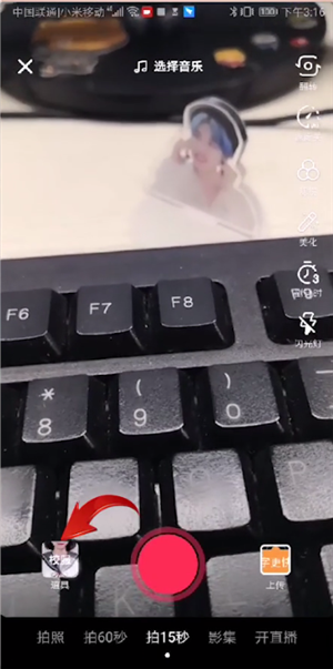 本视频是由华为mate 10 pro手机的Android9版本录制的。首先打开抖音短视频app,点击首页底端的加号按钮,进入拍摄页面后再点击左下角的道具选项,