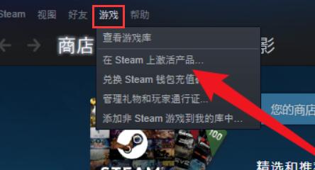 4、点击“游戏”,选择“在steam上激活产品”即可激活游戏。