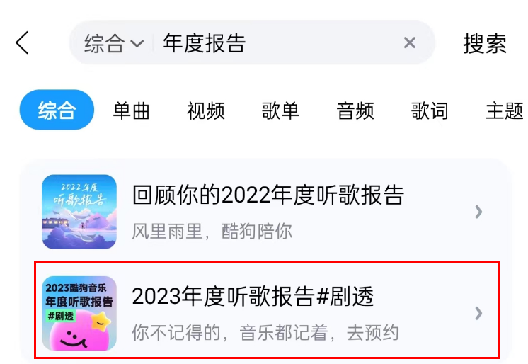1、打开酷狗音乐APP,搜索“年度报告”,点击进入2023年度报告。