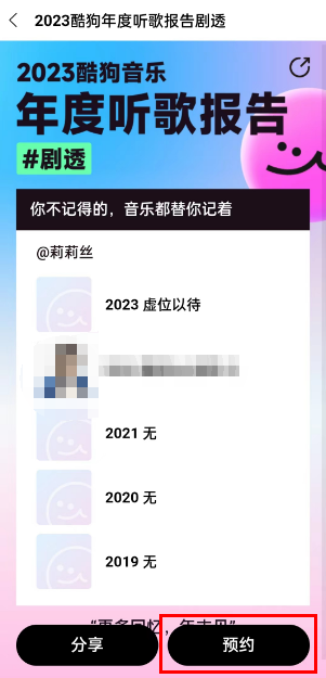 3、即可查看到自己这几年在酷狗音乐最喜欢的歌手,点击去预约,即可预约完整的2023年度报告。