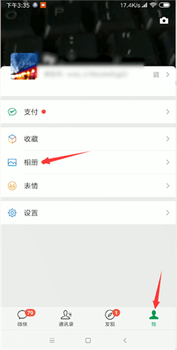 打开微信,点击右下角我,选择相册,