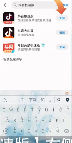 首先打开安卓手机自带的下载应用软件【应用市场】,然后点击顶部搜索栏,接着输入“抖音极速版”,点击右下角【搜索】,再点击【抖音极速版】右侧的【安装】即可。