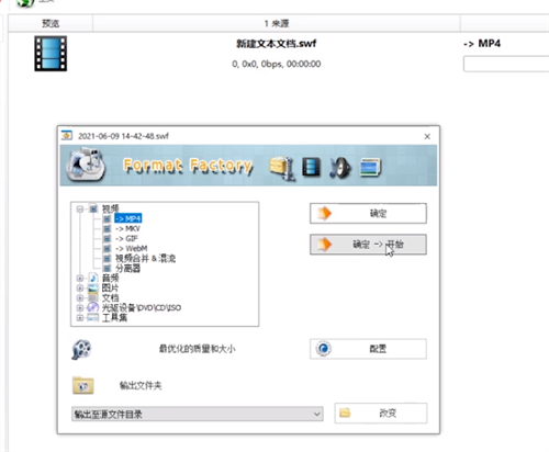 3.将文件进行转码:视频中以格式工厂应用为例来转码swf文件,首先打开格式工厂,随后将swf文件拖拽至格式工厂之中,再点击选择转码为mp4格式,最后点击转码进程界面中的开始即可让视频开始转码。转码成功的视频会显示在原swf文件旁边,最后只需要使用任意一样能打开mp4格式的视频播放器即可播放文件。