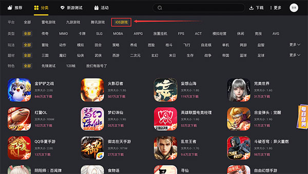 3、我们打开雷电游戏中心,在分类中选择【ios游戏】即可快速找到此类作品。但此分类下并没有显示全部的ios游戏,具体的还要看详情页介绍,小编在此就不一一举例了。