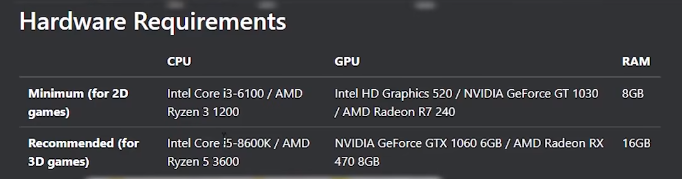 Windows 的最低要求:Intel HD Graphics 520 / AMD Radeon Vega 3
