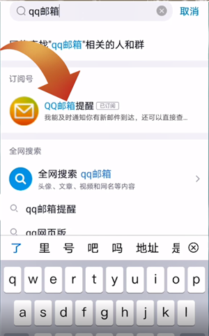 这时输入QQ邮箱,点击搜索,这时在订阅号底下点击QQ邮箱提醒,