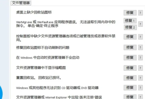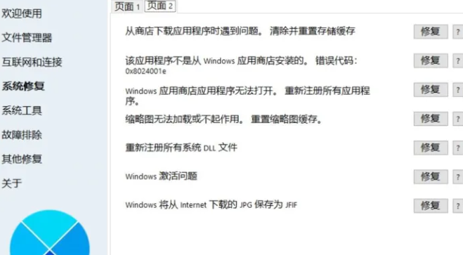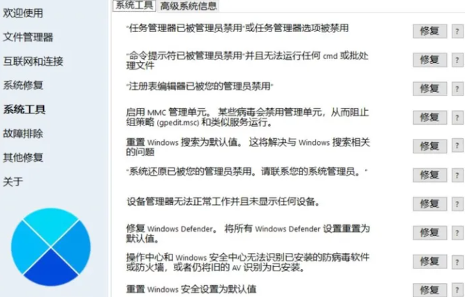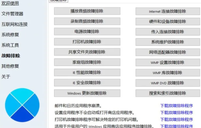 2、启动后,即可看到此软件涵盖诸多电脑问题修复功能,包括文件管理器、互联网与连接、系统修复以及故障排除等方面。
