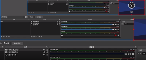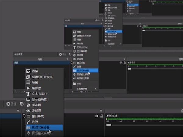 1.在主页面中点击来源下方的+号选项,随后点击视频采集设备,这样就可以在OBS中添加摄像头,多次点击+号选项即可添加多个不同的摄像头。在添加完成之后可以调整摄像头变为相同的大小,或者把两个摄像头叠在一起。