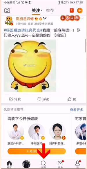 首先打开微博app,在底端点击发现,