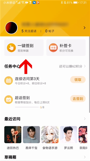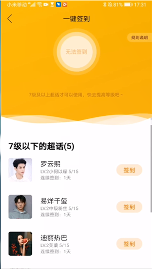 进入页面后点击一键签到即可成功签到。不过需要注意的是7级以上超话才可以使用该功能。