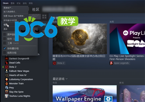 1.steam overlay问题可以在设置中设置来开启,在steam主页面中点击页面左上方的steam选项,随后点击设置进入设置页面。